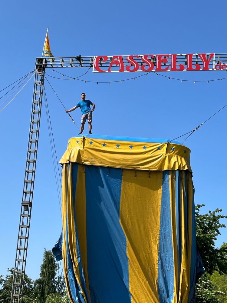 Am Samstag den 27. Mai haben viele fleißiger Helfer*innen der aus der Elternschaft und dem Kollegium der EGS Kerpen das Zirkuszelt mit der Familie Casselly am Schützenplatz aufgebaut. Auch in schwindelerregenden Höhen sind diese sicher, wie auf dem Foto zu sehen ist...