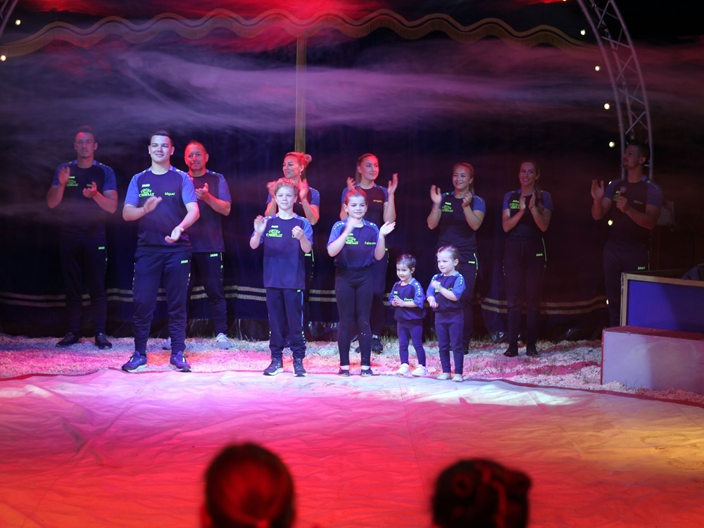 Kurz vor Beginn der Vorstellung stellten sich alle Nachwuchskünstler*innen dann vor dem Eingang des Zirkuszeltes auf. Sie liefen strahlend und winkend in die Manege ein – vor drei ausverkauften Vorstellungen, das Zelt war randvoll mit Zuschauer*innen. Diese kamen aus dem Staunen gar nicht mehr raus – und spendeten eine große Menge Applaus für alle Kinder.