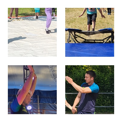 Nachdem wir uns alle gemeinsam begrüßt hatten, ging jede Gruppe mit ihrem Trainer oder ihrer Trainerin an den Übungsplatz und es ging los. Bei der Bodenakrobatik wurden fleißig Brücken, Handstände und Radschläge geübt, die Trampolinartisten lernten, sich klein wie ein Paket oder groß wie ein X zu machen...