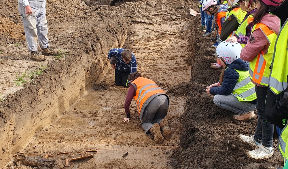 Das gesamte Grabungsteam der Firma arthemus um Claudia Holtschneider, Martin Heinen und Christian Riedl hatte die Besichtigung durch die jungen Besuchenden kindgerecht vorbereitet und erklärte die Arbeitsweise der Archäolog:innen. Sogar ein Metalldetektor kam zum Einsatz! Zum Abschluss bekam jedes Kind eine Scherbe geschenkt, so dass der Besuch erst recht unvergesslich bleiben wird. Auch dem Grabungsteam gebührt herzlicher Dank!