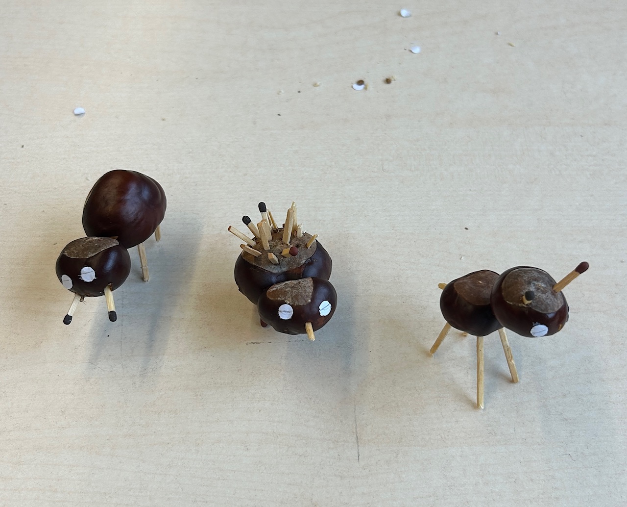 Wir haben heute im Kunstunterricht mit Kastanien gebastelt. In die Kastanien haben wir Streichhölzer gesteckt.